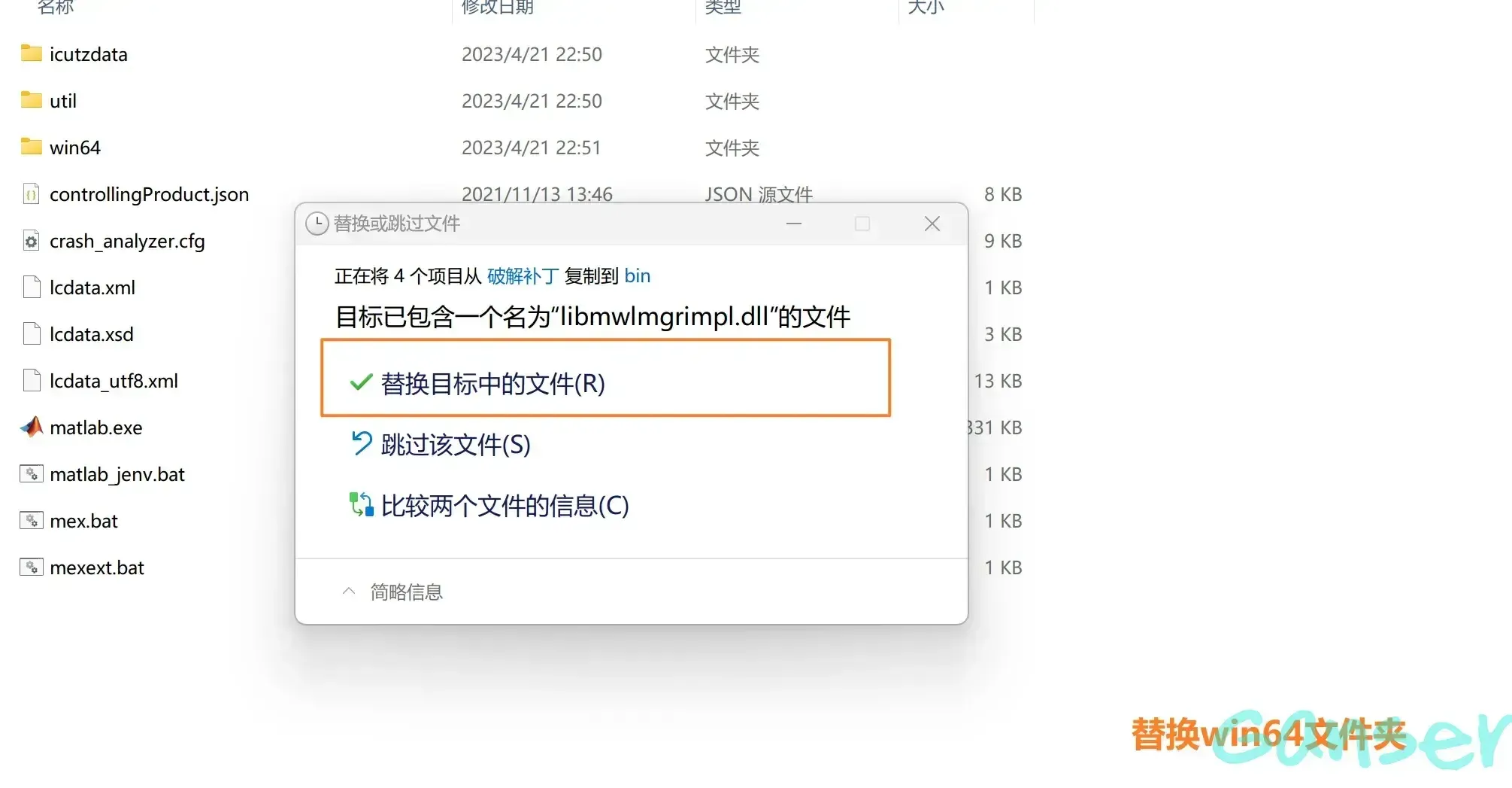 ② 替换win64文件夹:打开第⑥步中的安装路径,未更改的话在 C:\Program Files\MATLAB\R2022a\bin,我的是在D:\MATLAB\R2022a\bin,将上一步复制的文件夹粘贴过来,并替换文件。