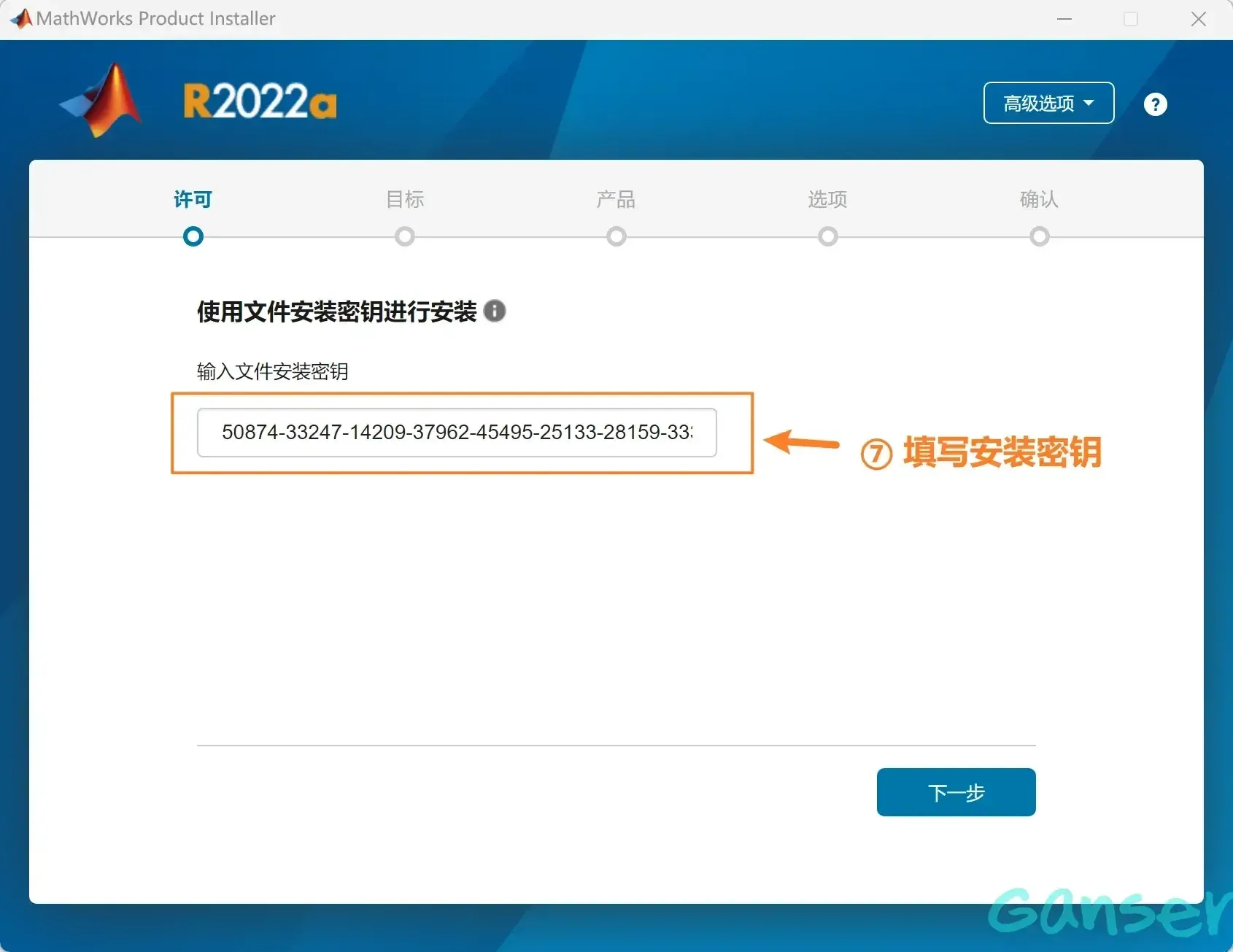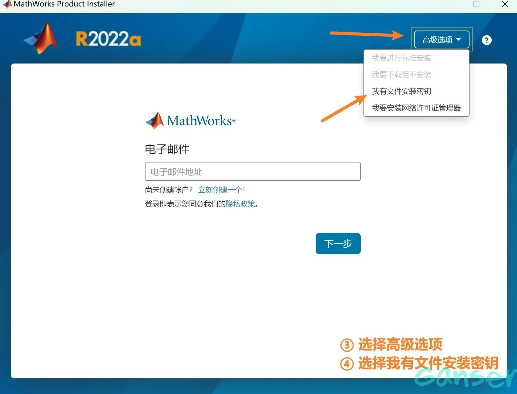 ① 点击右上角的“高级选项”,选择 “我有文件安装密钥”。