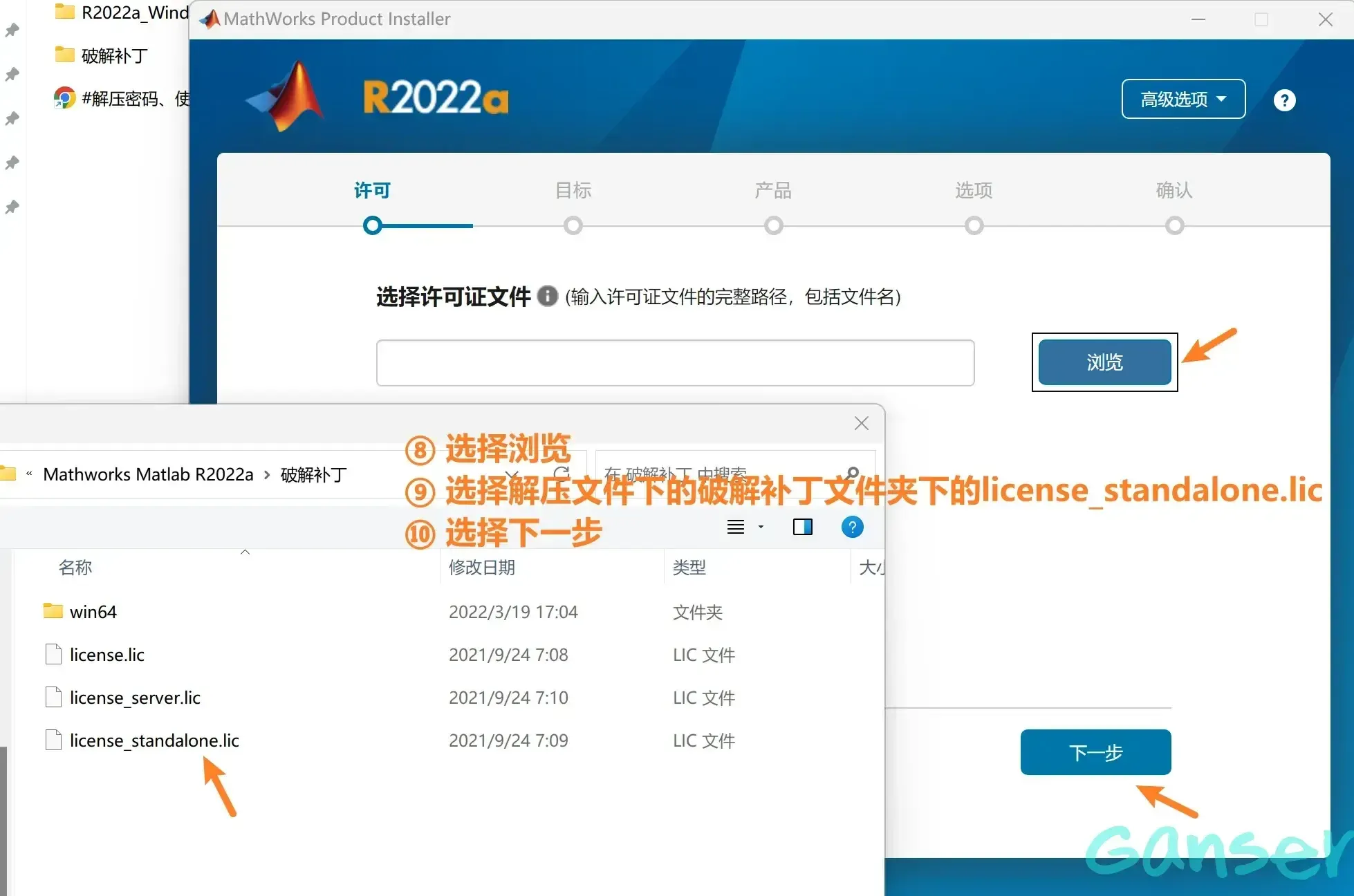 安装许可证文件这一步,点击浏览,选择安装包文件夹-破解补丁文件夹中的license_standalone,然后点下一步。
