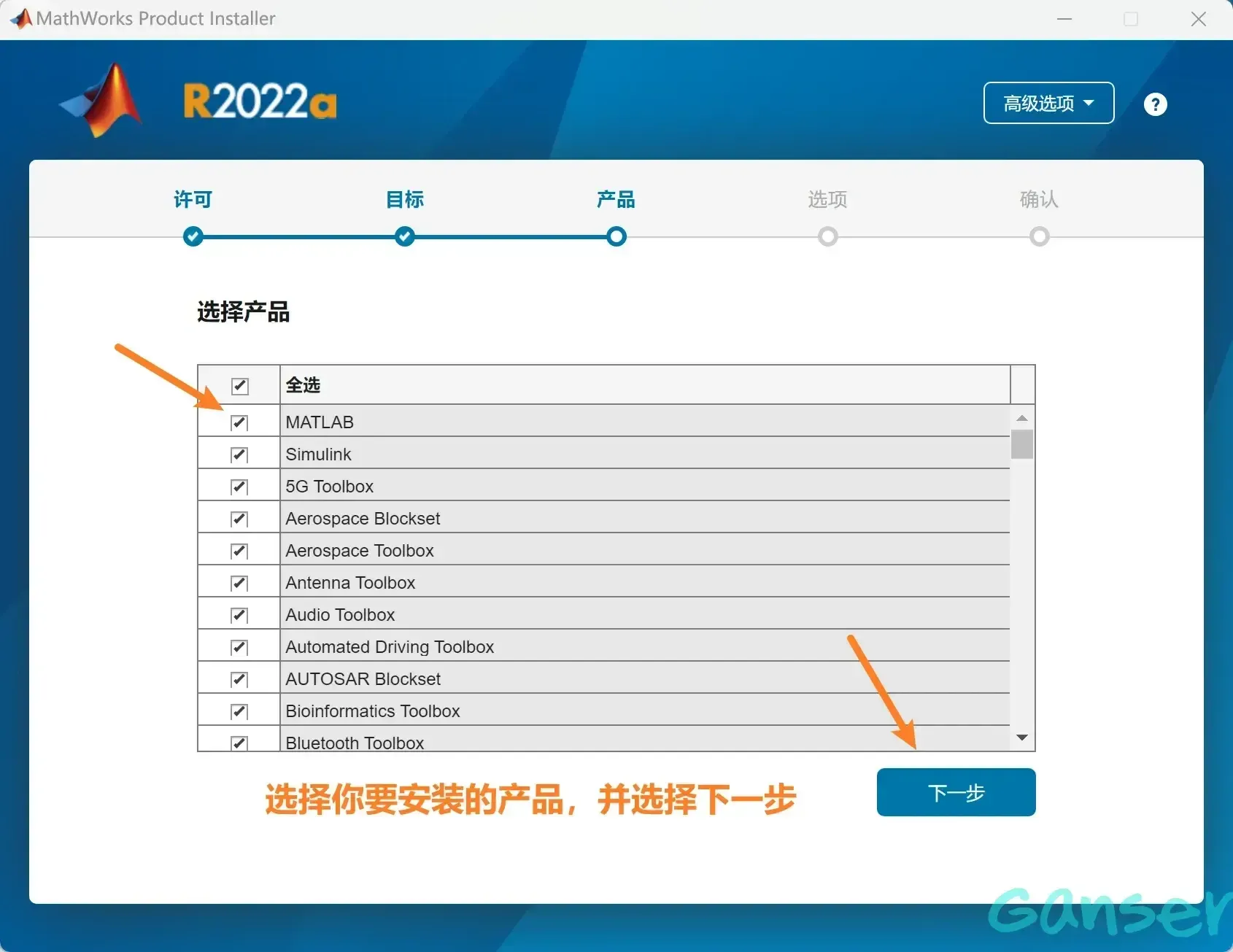② 选择自己的需要安装的程序,默认全选,选择下一步,直接安装。我只需要安装Matlab所以只勾选第一个,其他的产品不保证安装成功,可以尝试断网安装
