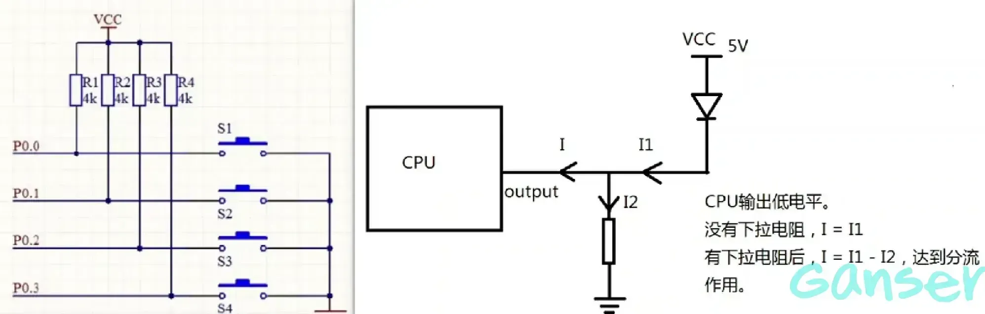 以上图按键电路为例,若按钮按下,则P0均处于低点位,状态确定没有问题;若没有上拉电阻且按钮没有按下,此时按钮处于悬空状态(也就是状态未知)。为了确保,按钮在未按下时,P0的引脚均处于高电平,那么就可以使用上拉电阻(接VCC)。