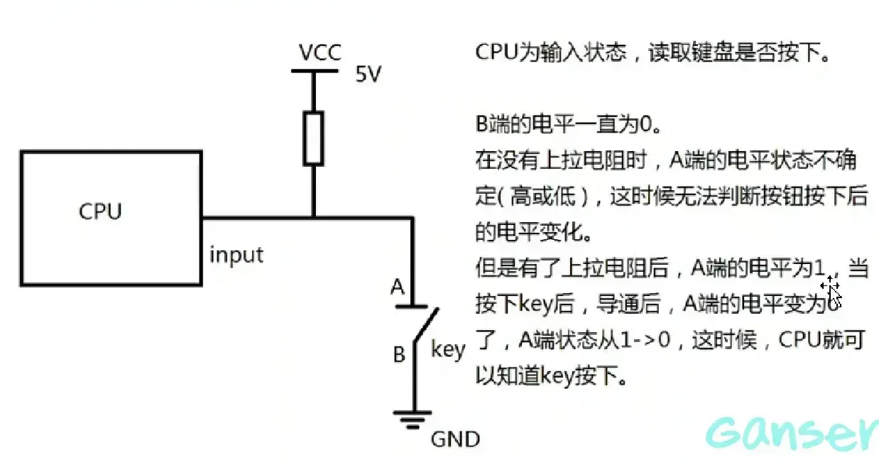 这里,单片机检测的时从1变0的过程。同理下拉电阻,单片机引脚输入端检测的时从0变1的过程。