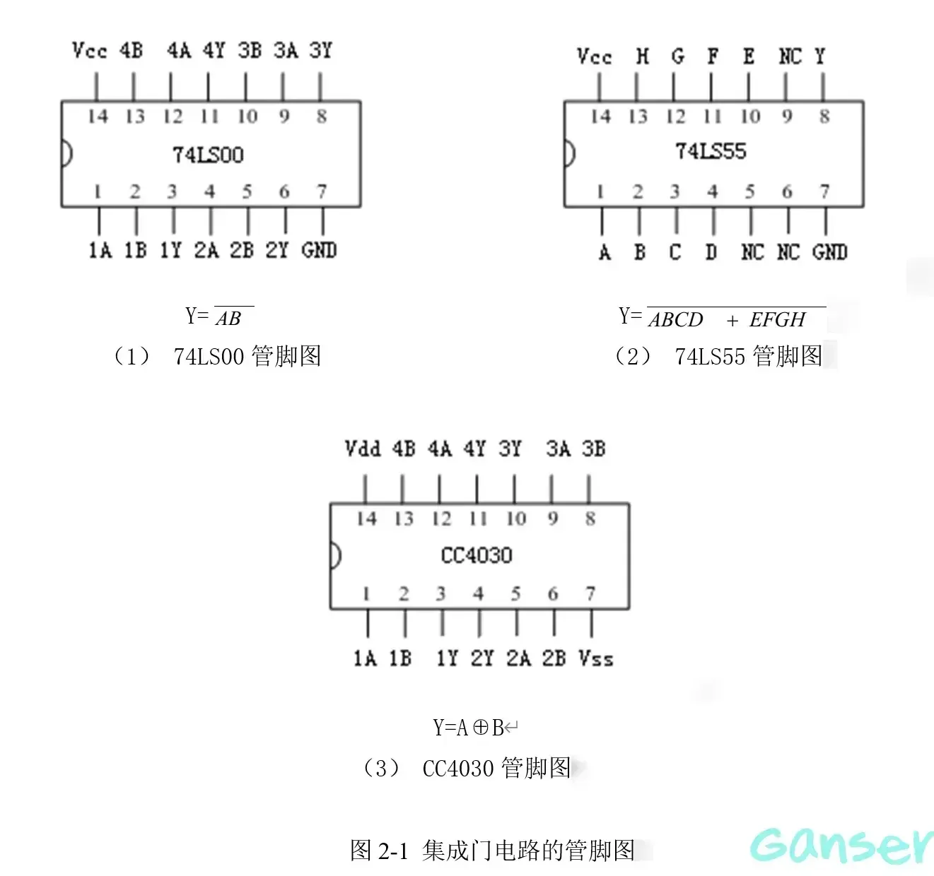 ③ 器件 74LS00 2输入端四与非门 1片;74LS55 4-4输入与或非门 1片 ;CD4030 2输入端四异或门 1片 。 它们的管脚图如图2-1所示。