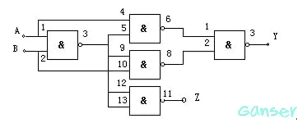 ① 选用二输入四与非门74LS00中的一个与非门,电源引脚接实验台+5V DC,输入引脚接逻辑开关(16个开关任选2个),输出引脚接发光二极管(16个发光二极管任选1个)。