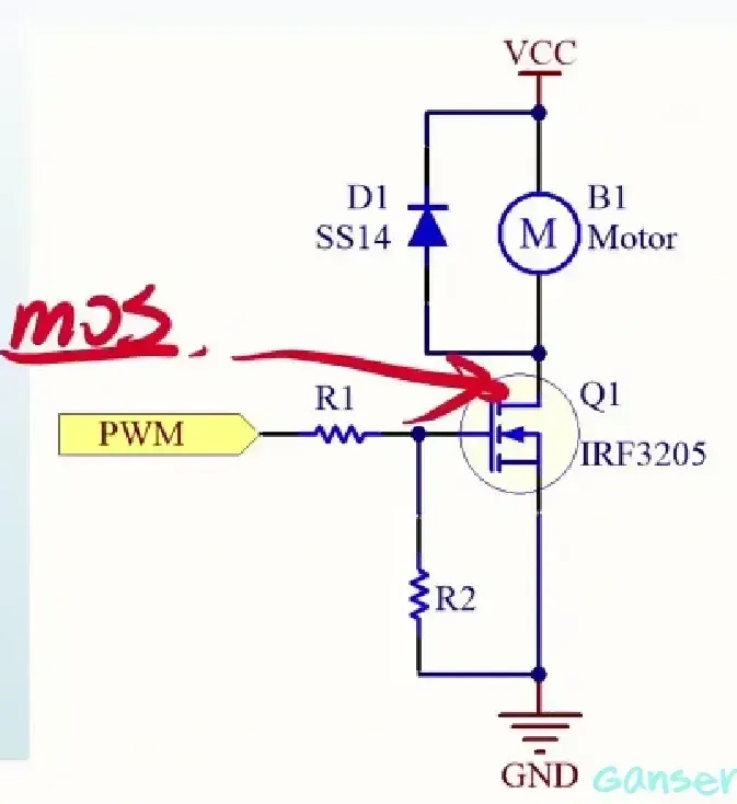 ① 注意:我们选择的NMOS管一定是I/O能够推动的MOS管(例如:IRF3205驱动电压是4V,单片机I\O口的输出电压为5V,可以直接驱动),但如果使用大电压驱动的MOS管,就需要使用MOS驱动芯片(例如:IR2014)。