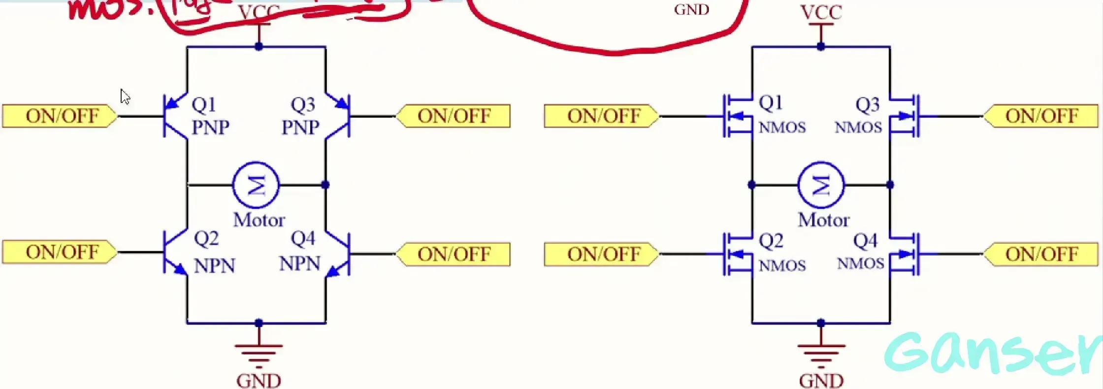 全桥驱动电路可以用来驱动直流电机正反转并可以完成调速的电路,该电路在电动牙刷、风扇等都用到H桥电路。这里要用到功率器件MOS管(金属氧化物晶体管,由电压驱动)。