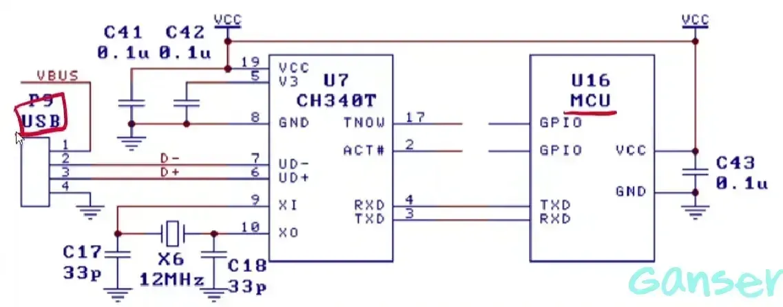 简单看一下CH340芯片,19、5、8脚分别是VCC、GND,外接滤波电容。9、10脚接外部时钟电路(有的转接芯片不需要时钟电路)。整个工作内容就是在3、4脚将USB通信发送的内容与MCU的TXD和RXD连接转为串口数据内容,发送到MCU,反之将MCU中的内容转为USB口的D数据,以此实现USB转TTL通信串口的目的。