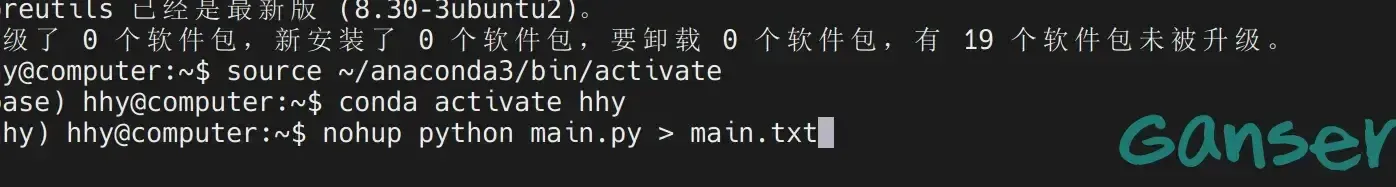 使用nohup python main.py > main.txt将main.py运行并挂起,并将程序的输出日志保存在main.txt