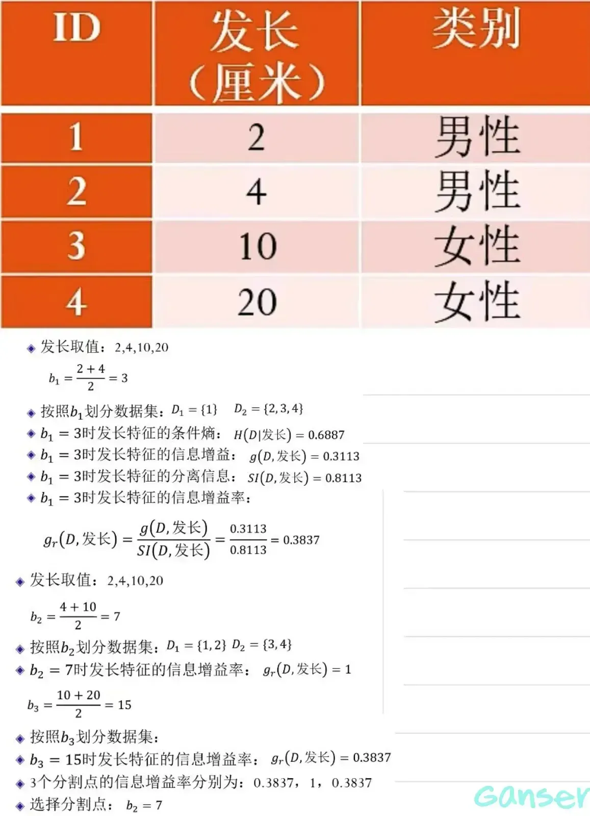 C4.5算法是对ID3决策树算法的改进,之所以要改进ID3算法,主要有以下原因:,信息增益倾向于选择取值多的特征,当特征取值多时,D被划分为多个子数据集,每个子数据集中的样本数可能比较少,里面只包含单一类别样本的可能性就比较大,这样就会导致条件熵比较小,从而使得信息增益比较大,在极限情况下,特征A的取值特别多,以至于每个样本都有一个不同的取值,这样每个子数据集就只含有一个样本,每个子数据集的类别都是确定的。比如:以毫米为单位的发长特征。(本质上还是数据量不足)