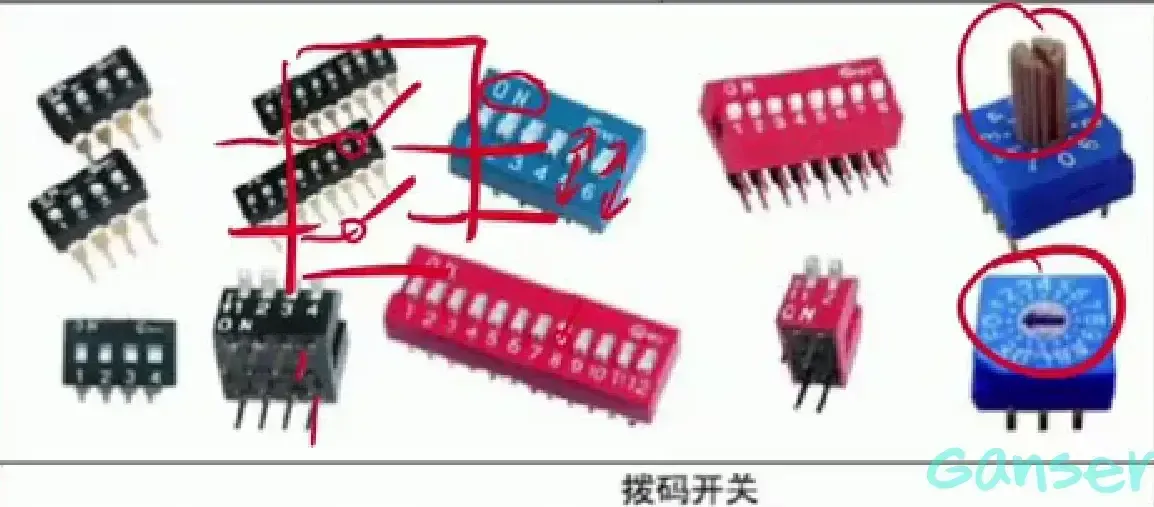 拨码开关可以永久储存一组二进制数值,其实就是0和1,其内部是一组开关。通过拨码开关我们可以控制模式切换或者通道选择等操作。