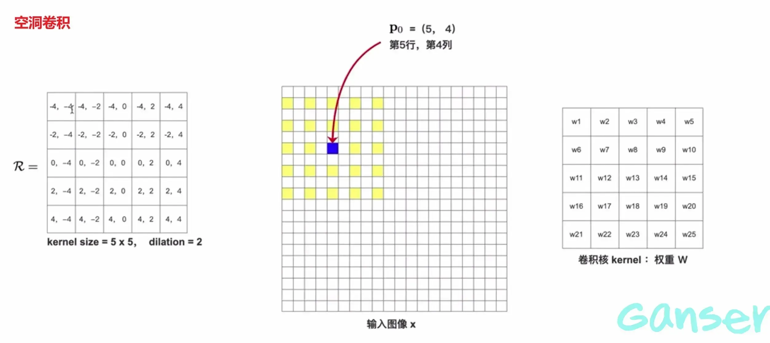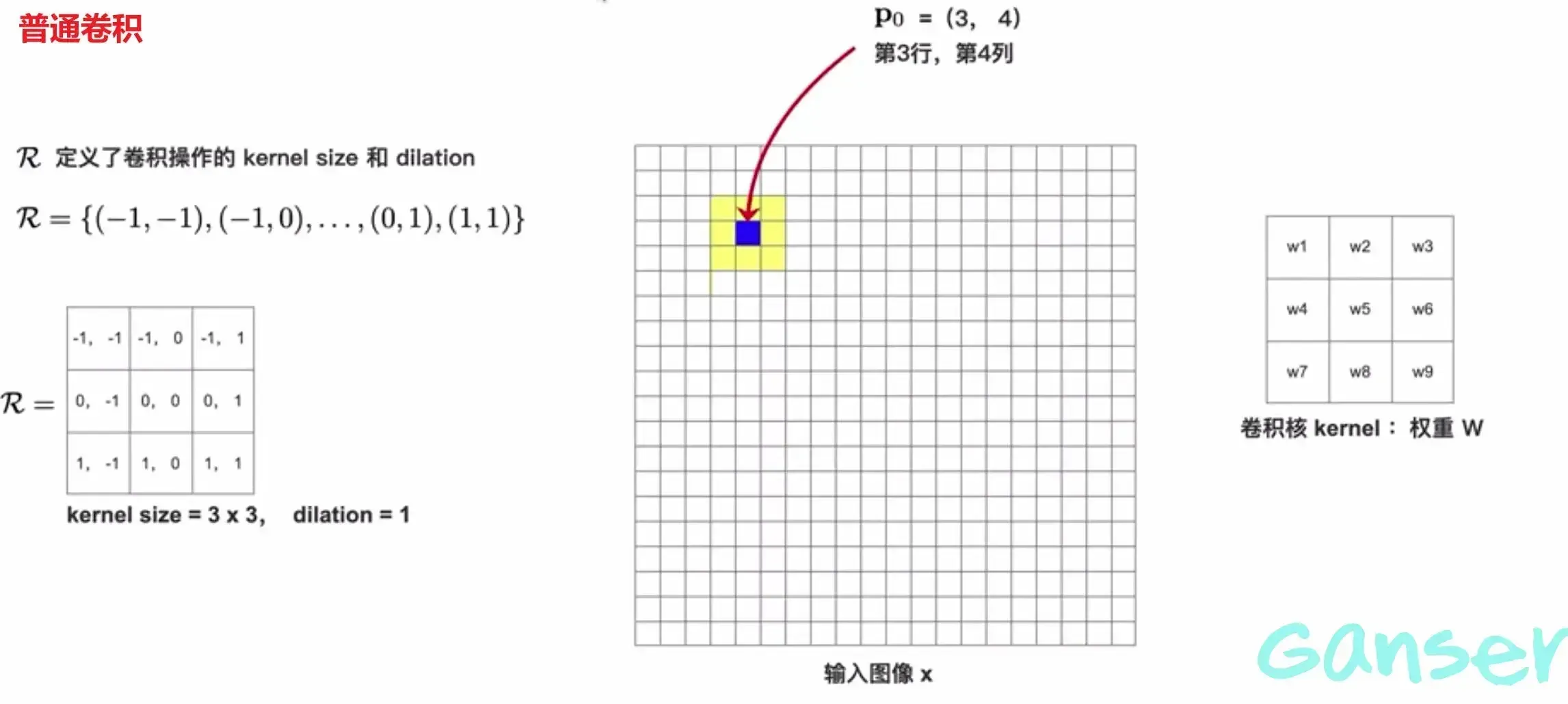 这里代表中心像素的坐标,代表基于窗中的临近元素坐标,它是相对于的,代表像素的像素值,代表卷积权重,是由与共同构成相对位置坐标的矩阵/集合。在这里定义了卷积尺寸和卷积模式(空洞卷积或者普通卷积)。