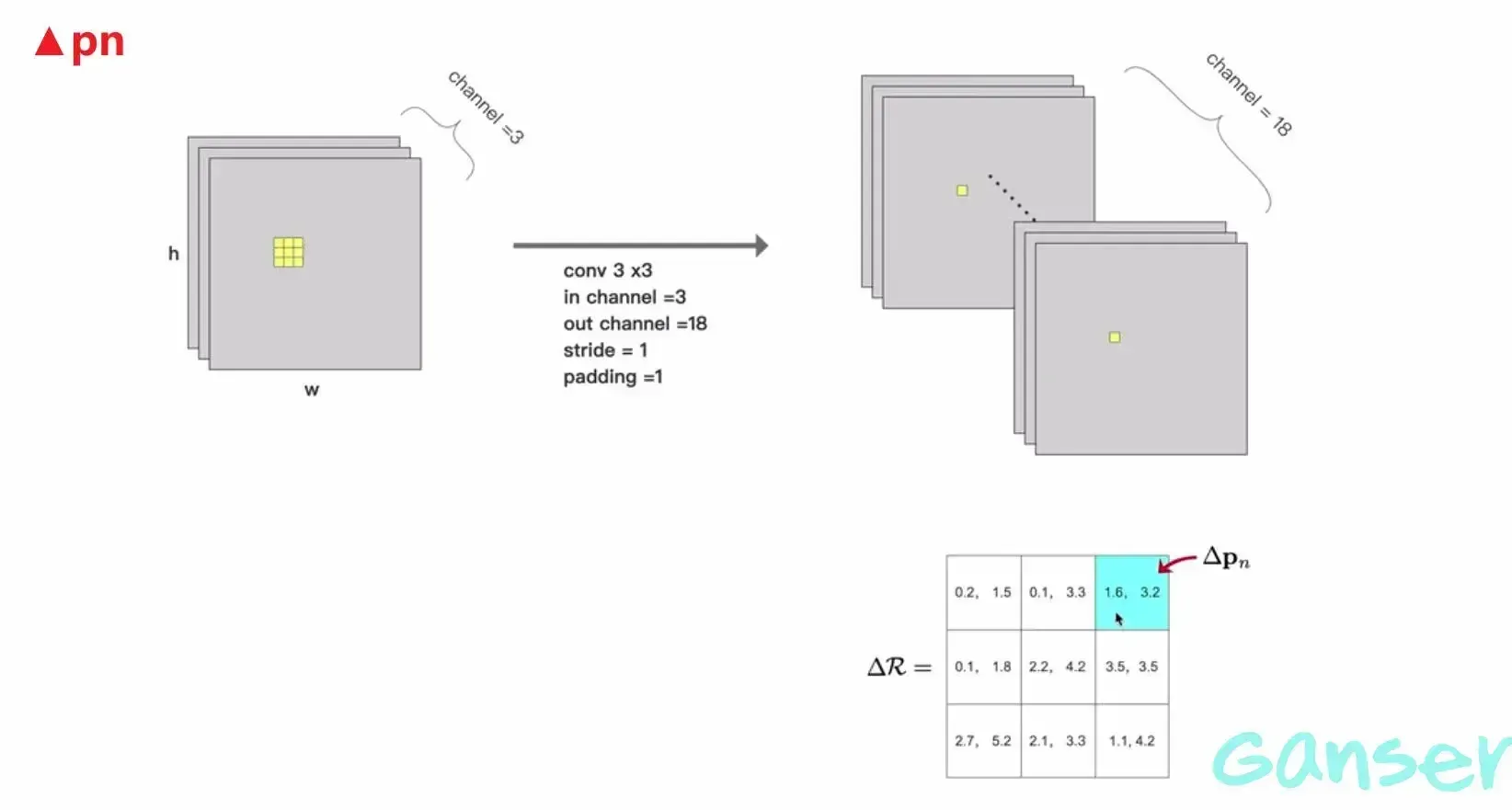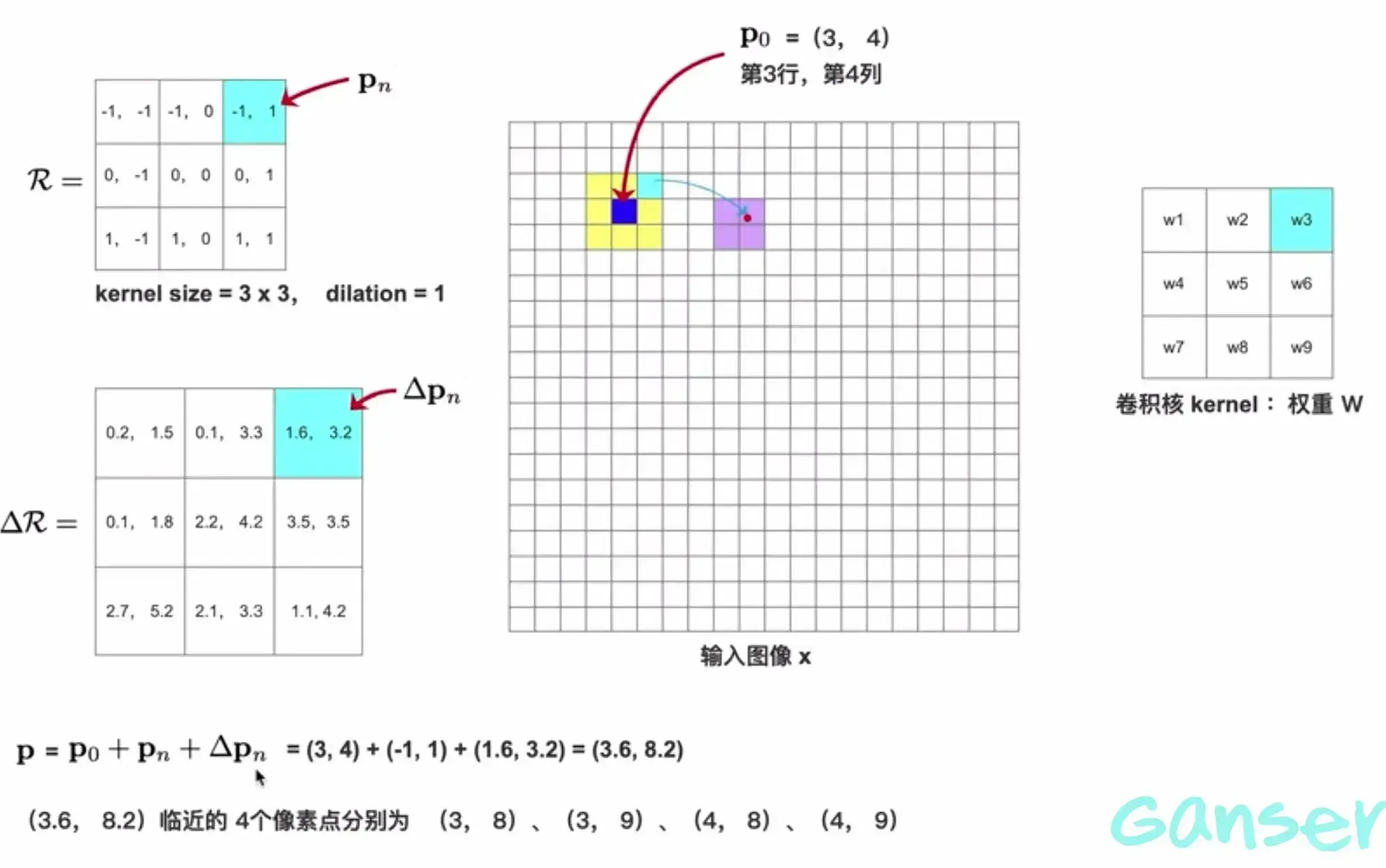注意到可变形卷积是在标准卷积的基础上加上了位置偏移量offset,在论文中指出是学习得到的值,为小数,由图像经过普通卷积计算得到,下面理解该是如何得到的。