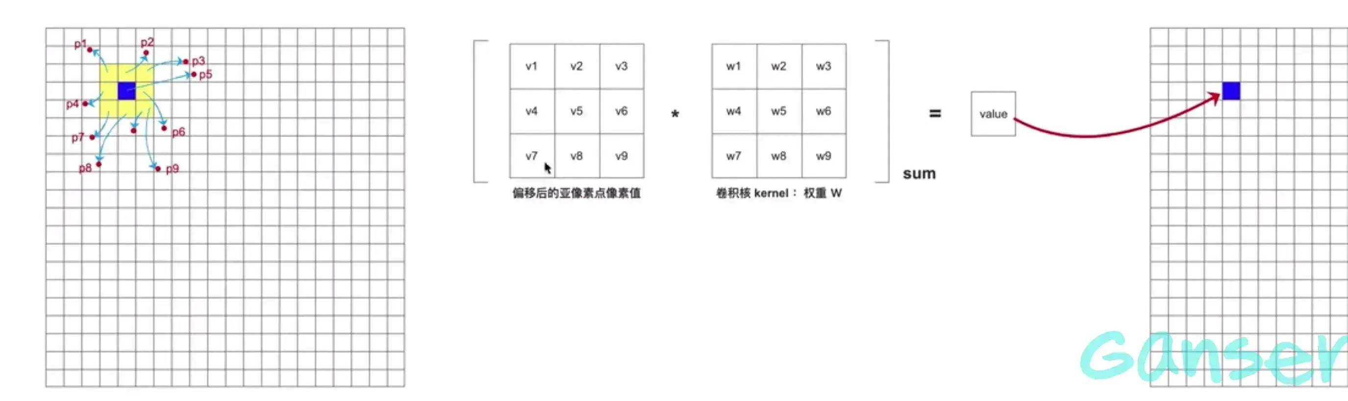 针对以上得到的偏移位移矩阵,用于计算相邻元素的偏移位置,从而得到偏移后的像素值(称之为亚像素点的像素值),使用该像素值与卷积核进行卷积从而得到可变形卷积的结果。