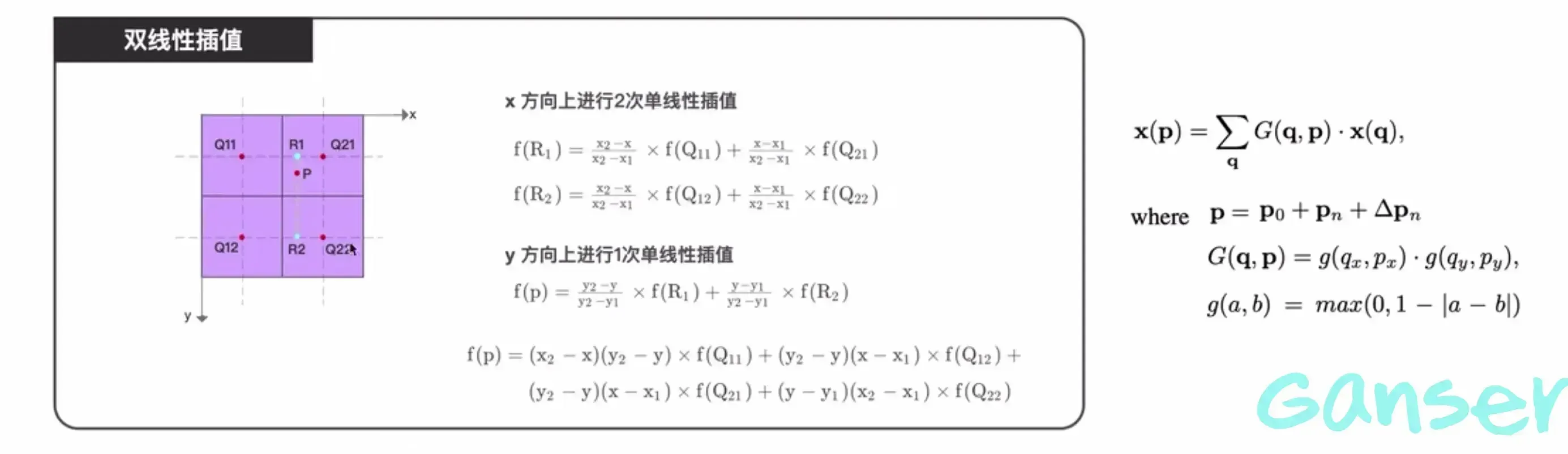 这样可变形卷积的操作就此完成。作者在针对偏移坐标的像素值的求解使用双线性插值法求得。找到亚像素点相邻的4个像素点,用该方法求解目标亚像素点的值。