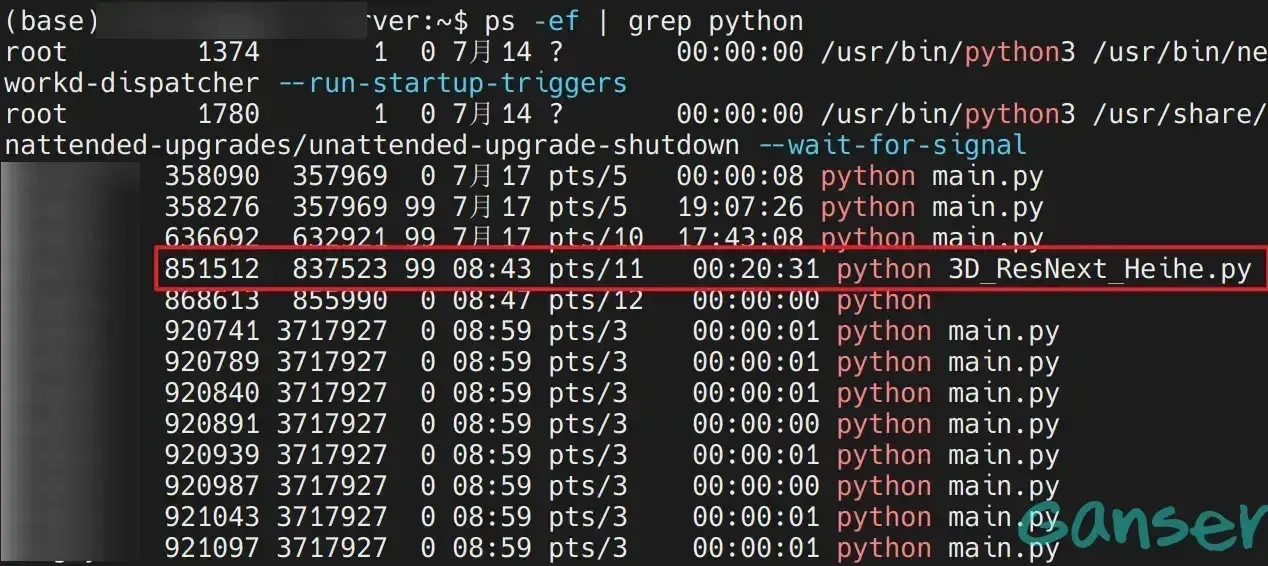 Linux可以通过ps指令相关参数查看各种进程,但是查看所有进程好比大海捞针,所以查看python相关进程即可