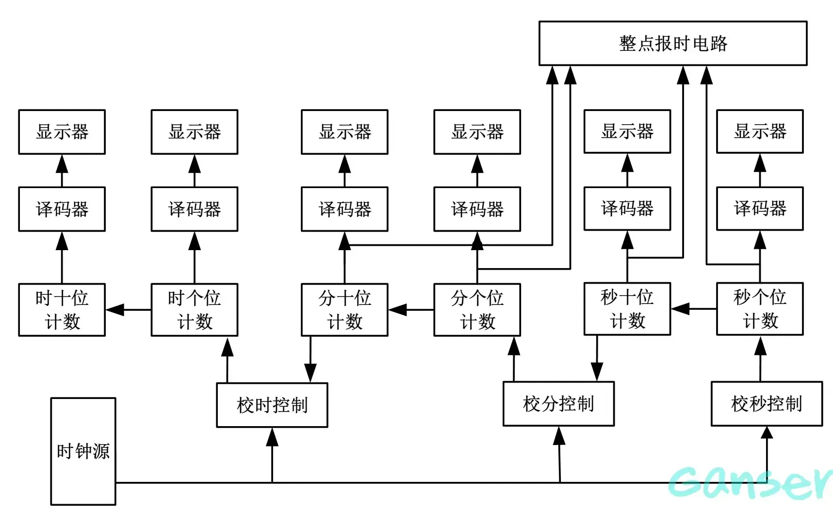 由振荡器产生的信号经过分频器作为产生秒脉冲,秒脉冲送入计数器,计数结果经过“时”、“分”、“秒”,译码器,显示器显示时间。其中振荡器和分频器组成标准秒脉冲信号发生器,由不同进制的计数器,译码器和显示电路组成计时系统。秒信号送入计数器进行计数,把累计的结果以“时”,“分”、“秒”的数字显示出来。“时”显示由十二进制进制计数器,译码器,显示器构成;“分”、“秒”显示分别由六十进制的计数器,译码器,显示器构成;校时电路实现对时,分的校准。