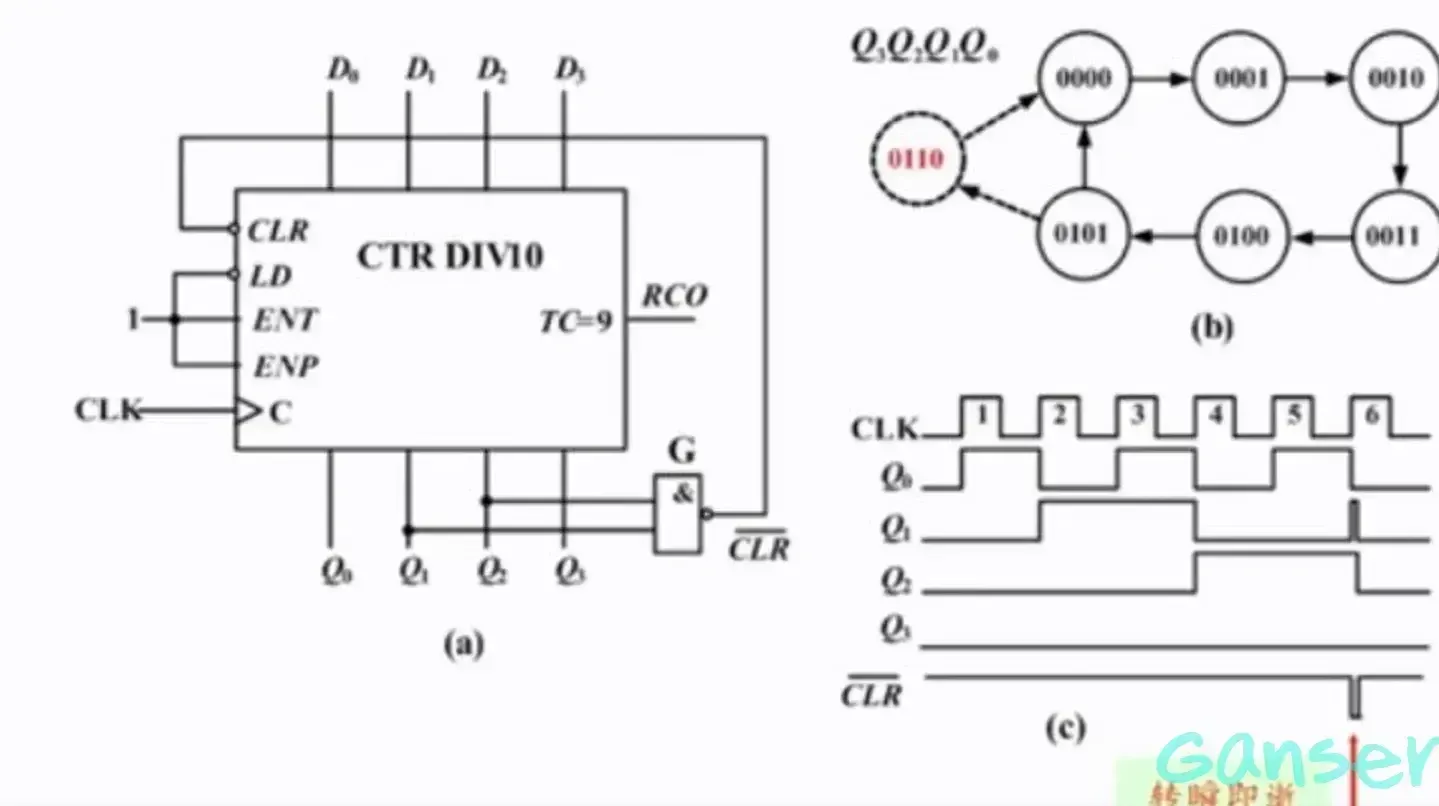 接收到第6个时钟脉冲后状态变为0110,如果此时利用状态0110,通过组合电路产生异步清零信号,并反馈到74160的清零端,于是计数器尽在状态0110短暂停留后就立刻复位到0000状态,这样,就跳跃了计数器74LS160的4个状态,而获得了6进制计数器。
