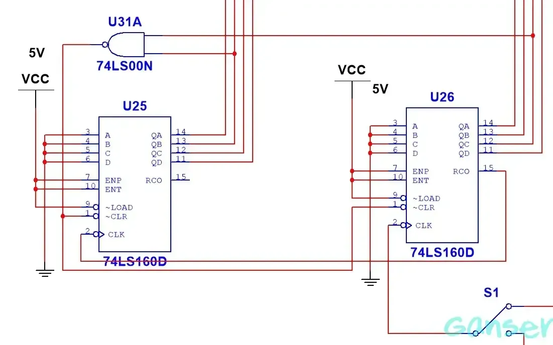 基于以上思想,我们使用两个74LS160十进制计数器作为秒钟的个位和十位。个位与十位计数器之间采用同步计数的连接方式,将个位计数器的进位输出信号接至十位计数器CLK,完成个位对十位计数器的进位控制。选择十位计数器QC与QB做反馈端,经与非门输出控制CLR,接成六进制计数形式。当计数器状态60时,瞬间异步清零00000000,并输出一进位。其具体在电路中的接法如图所示。