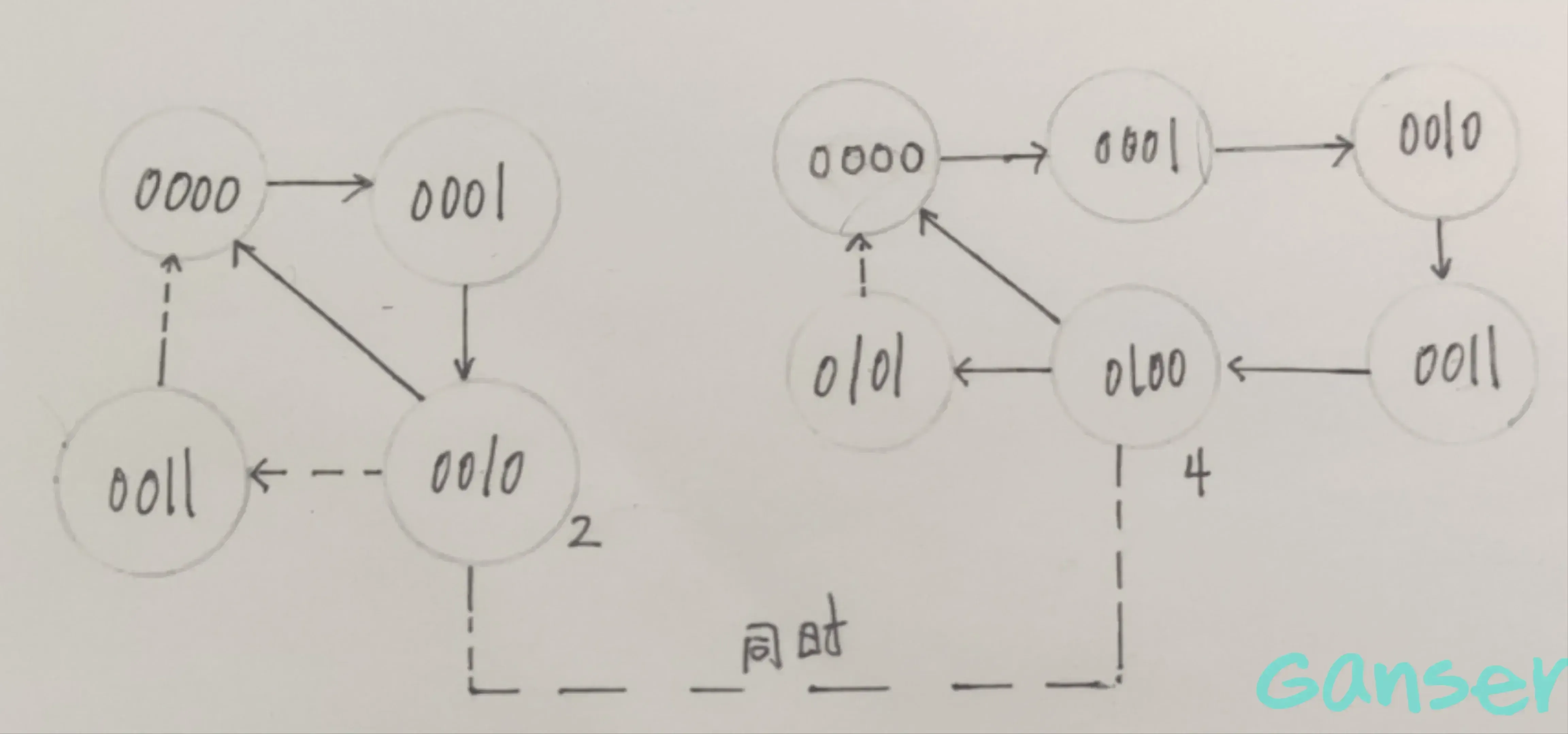 ⑤ 接收到第4个时钟脉冲后状态变为0100,