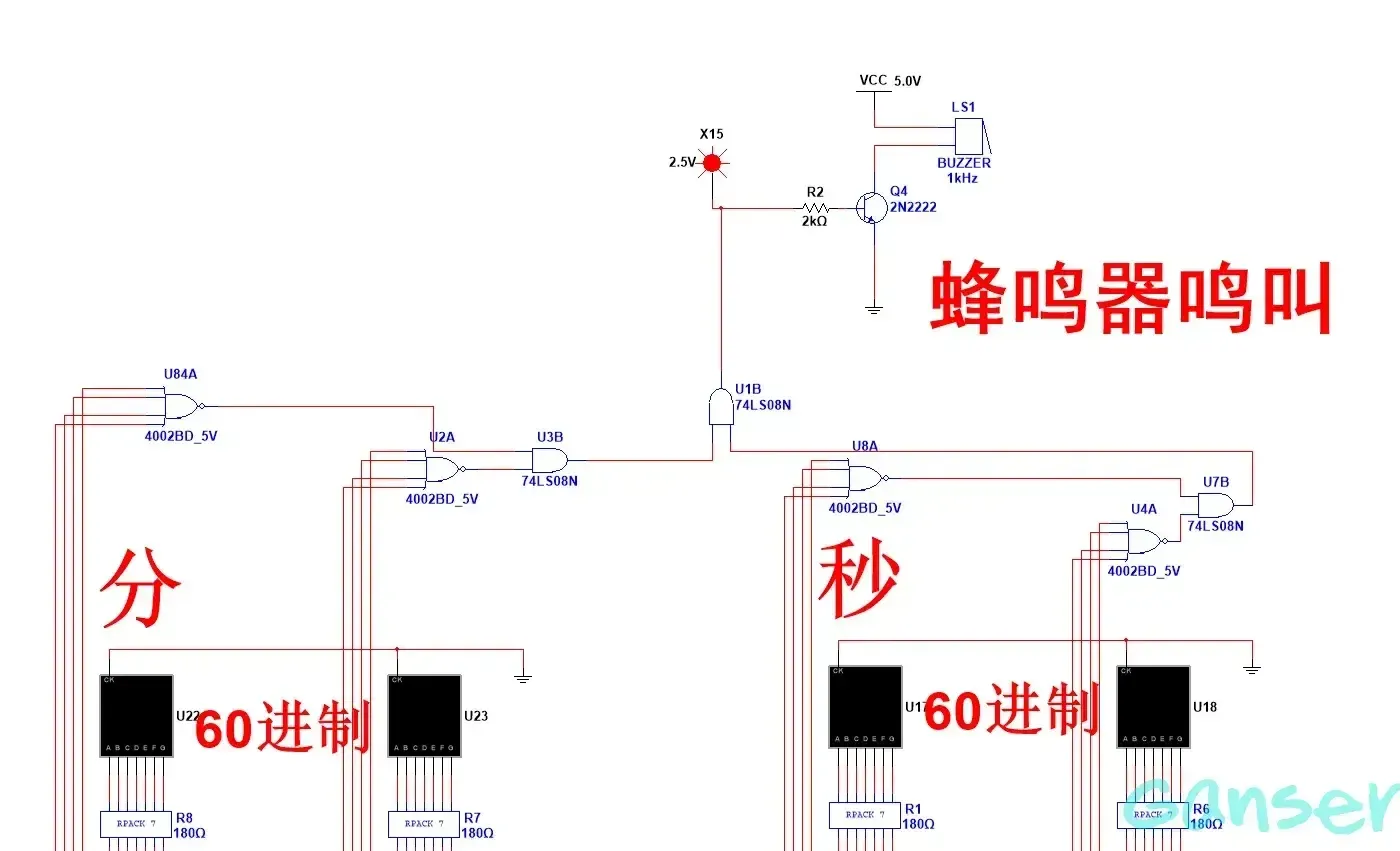 整点报时电路就是电路在整点时产生报时信号,整点即分钟和秒钟皆为零,转换成二进制码就是零零电路,主要使用到的是四输入的或非门分别连接到分钟电路的十位、个位,秒钟电路的十位、个位,输出端0000经过或非门均输出高电平,个位、十位经过或非门后输出结果经过与门输出。秒钟整点检测电路原理相同,在二者输出结果,经过与门输出高电平,从而触发蜂鸣器工作,这就是整点报时电路的原理。