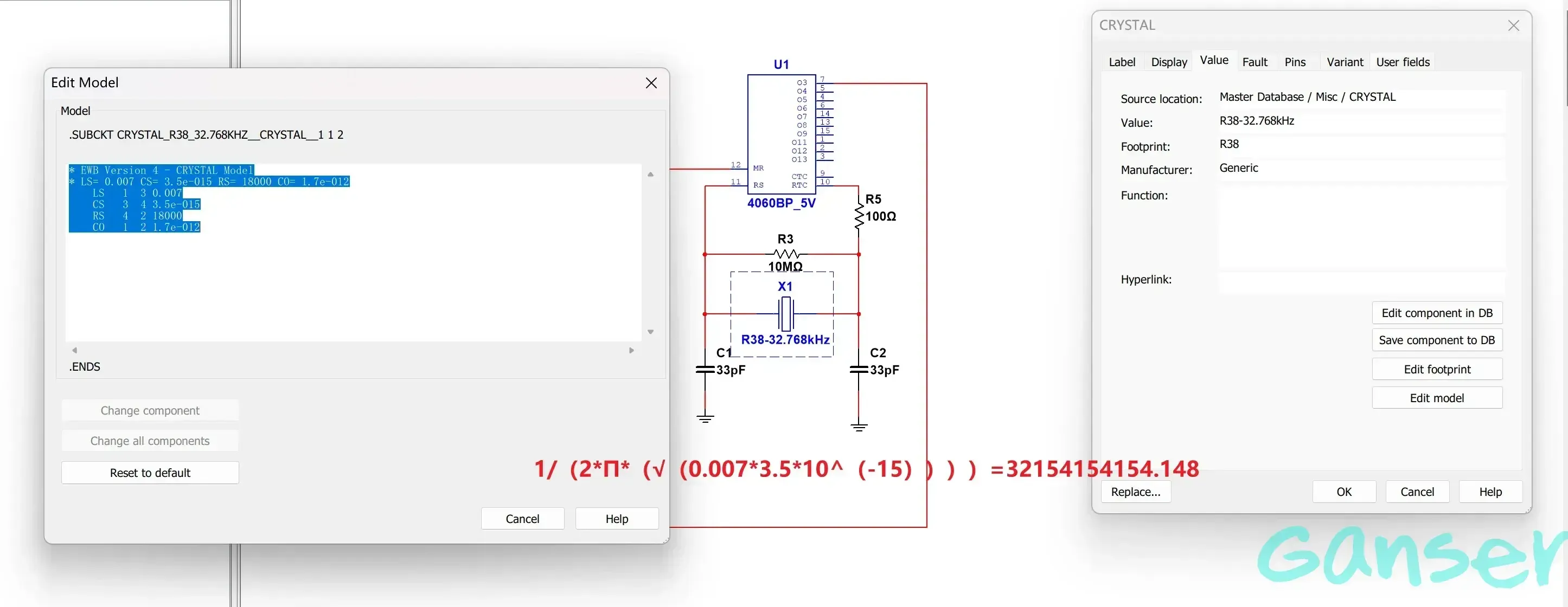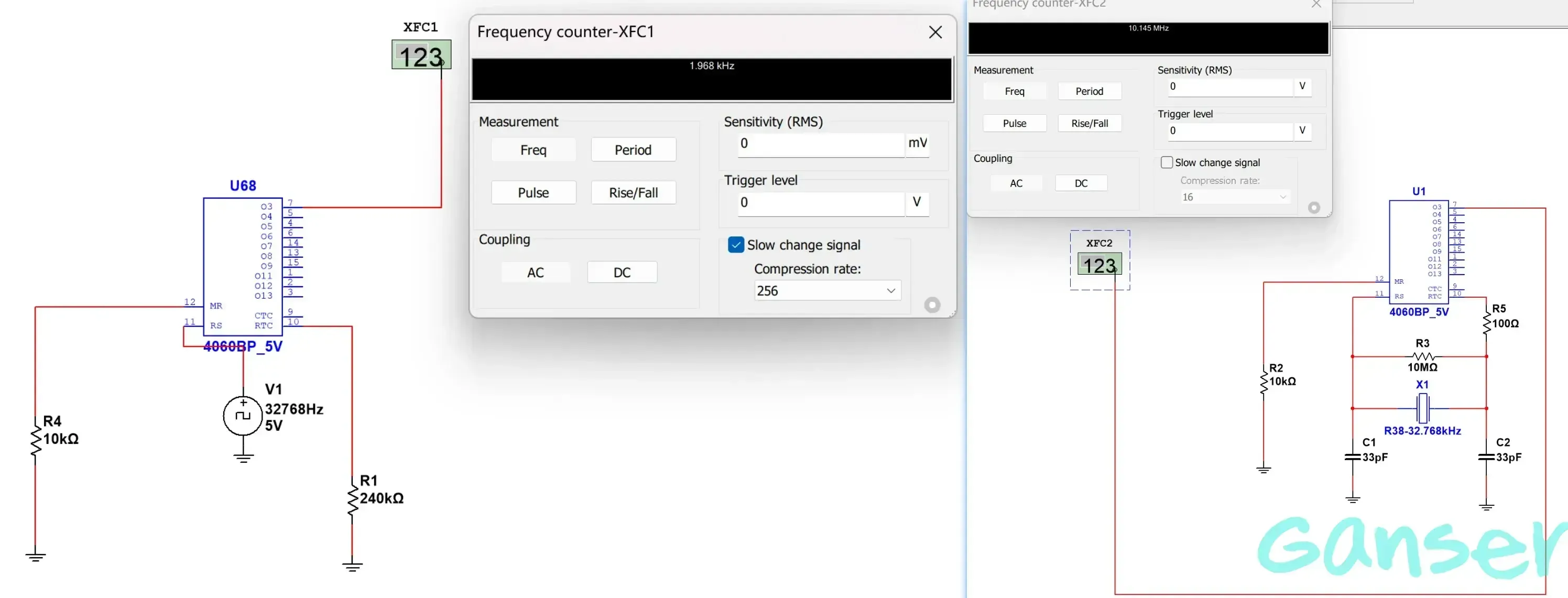 在2.2.1小节,我们介绍了晶体振荡器的原理,课程设计要求我们使用32768Hz的晶振加分频器产生1Hz标准秒脉冲,但在实际仿真过程中我们会发现Multisim软件中的32.768KHz晶振参数是完全是错误的,我们可以参考文献1中的描述,下面是我实际使用过程中的计算过程。根据晶振频率计算的公式:$ \frac{1}{2Π\sqrt{LC}} $,可以计算出Multisim为我们提供的晶振实际频率为:32154154.1484680比我们需要的频率高了3个数量级,根据文献提供的spice模型数据进行更改仍不能解决此问题,因此最后放弃使用晶振改用标准脉冲信号源。当然我们仍然可以证明4060可以进行14分频,将32768Hz的脉冲分频输出为2Hz脉冲,如下是两组对比。实际焊接的时候的确可以使用标准的晶振经过15个2分频产生1Hz秒脉冲。