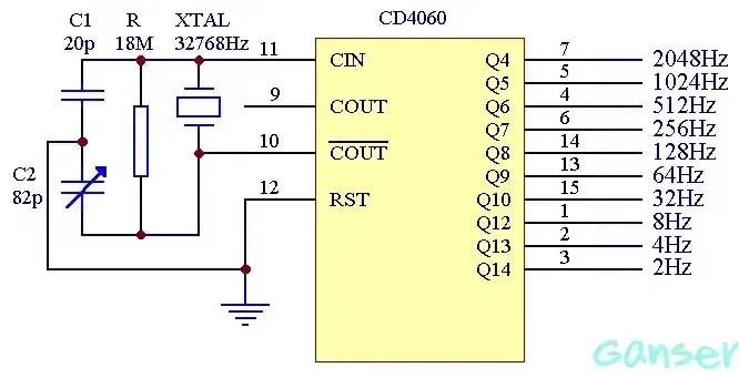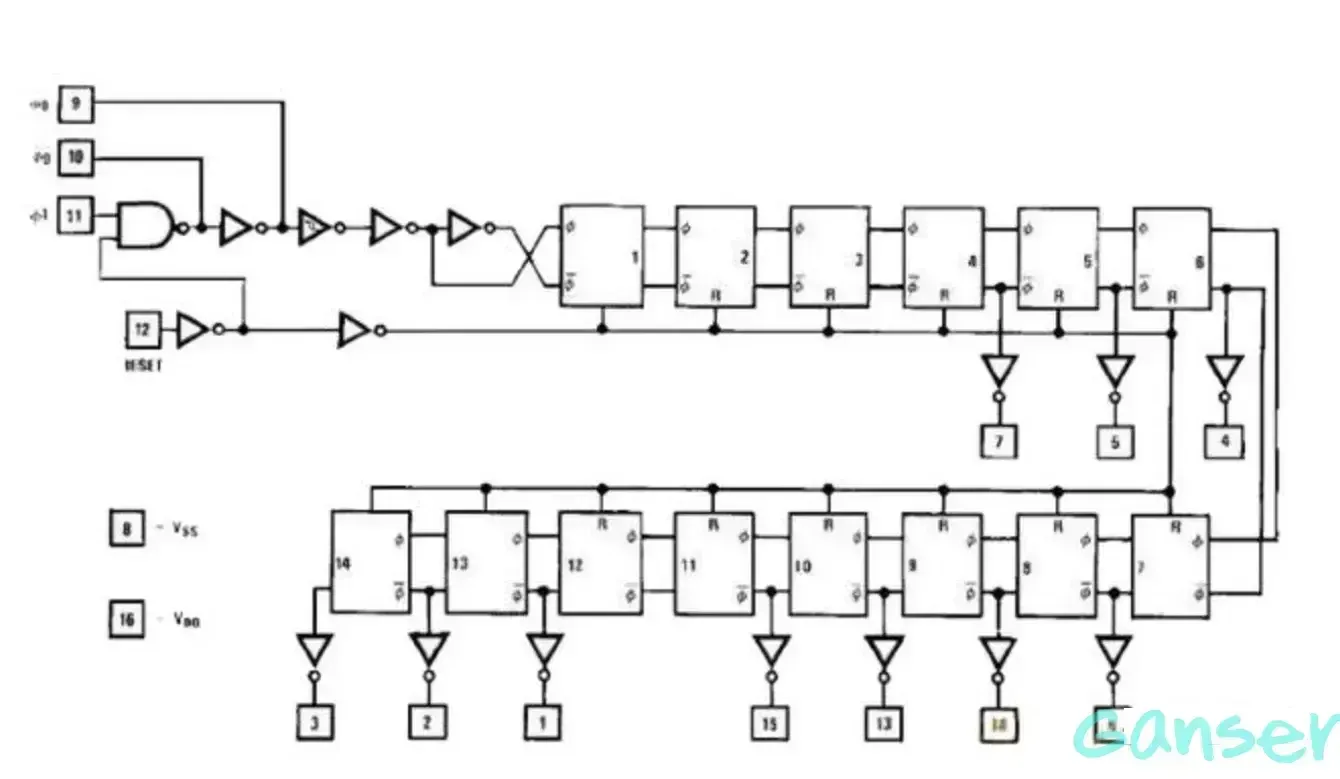 CD4060为双列引脚,其中1脚为12分频输出、2脚为13分频输出、3脚为14分频输出、4脚为6分频输出、5脚为5分频输出、6脚为7分频输出、7脚为4分频输出、8脚为电源负极Vss、9脚为信号正向输出、10脚为信号反向输出、11脚为信号输入、12脚为复位端、13脚为9分频输出、14脚为8分频输出、15脚为10分频输出、16脚为电源正极Vdd。CR为高电平时,计数器清零且振荡器使用无效。所有的计数器位均为主从触发器。在CP1(和CP0)的下降沿计数器以二进制进行计数。在时钟脉冲线上使用斯密特触发器对时钟上升和下降时间限制。