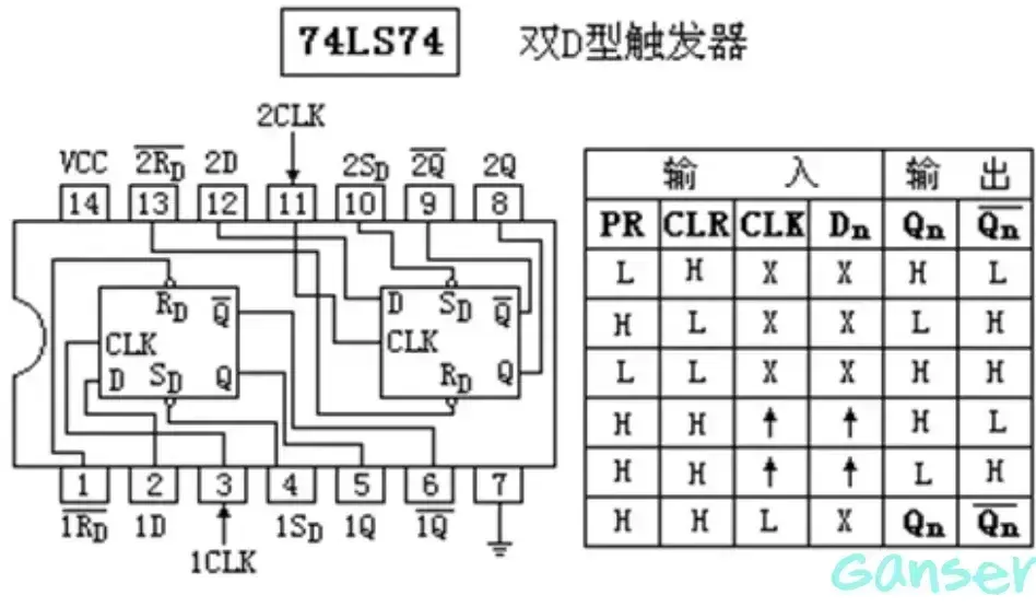 使用32768Hz的晶振实现1Hz秒脉冲的输出需要15次2分频,CD4060只能实现14次二分频,因此我们还需要外接一个D触发器实现依次二分频。这里使用上升沿触发的双D触发器74LS74,把其中的一个D触发器的Q’输出端接到D输入端,时钟信号输入端CLOCK接时钟输入信号。这样每来一次CLOCK脉冲,D触发器的状态就会翻转一次,每两次CLOCK脉冲就会使D触发器输出一个完整的正方波,这就实现了二分频。
