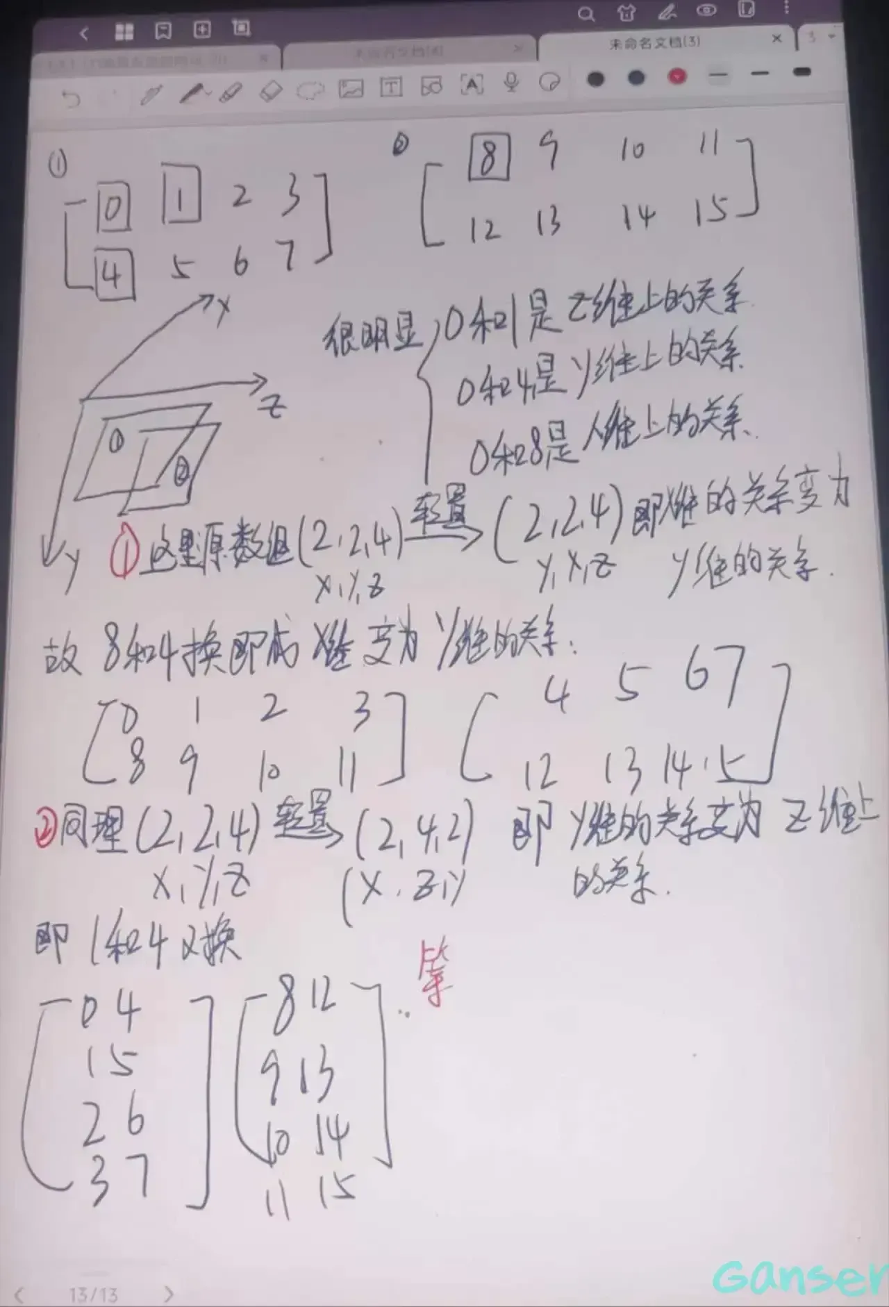 我们可以将原数组看作是两个矩阵,搞清数值之间的x,y,z之间的关系即可。