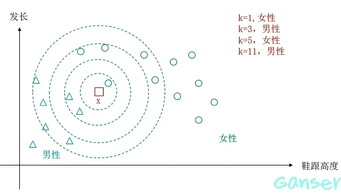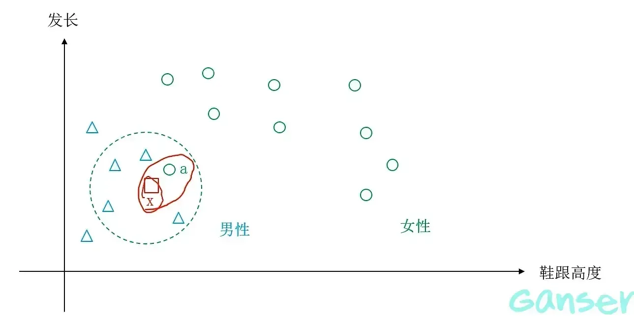 以上最近邻方法存在一些疑问,当数据样本存在噪声时(假设样本标签存在标记错误)或有一些样本虽被标记为男性(女性)但不具备对应性别的典型特征,这样依据最近邻对待分类样本进行分类,为免存在武断,误判等问题。因此,为了解决这一问题,我们需要将视野扩大到待分类样本周围k个样本。这种方法就是K近邻算法